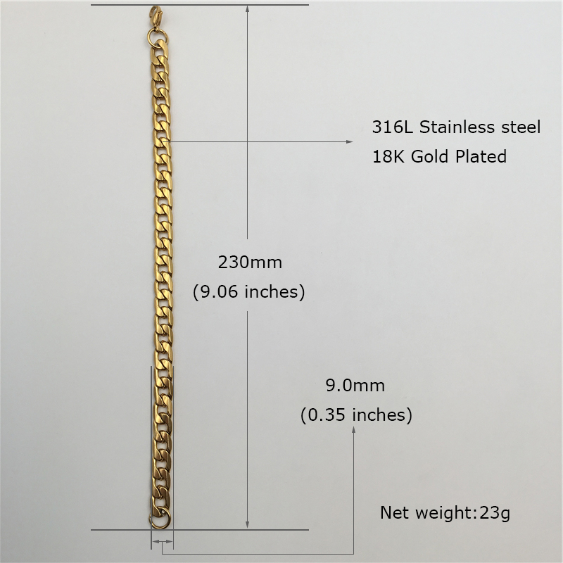 Men's Fashion Jewelry Gold-color 9mm Curb Link Chain 316L Stainless Steel Bracelet B118
