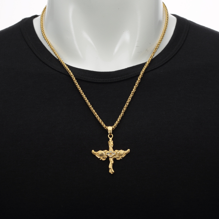 Vintage Cross Shape Wings Pendant New Design Jewelry Rhinestone Inlaid Gold Plated Stainless Steel Cross Necklace S409/S410 | ||||||
