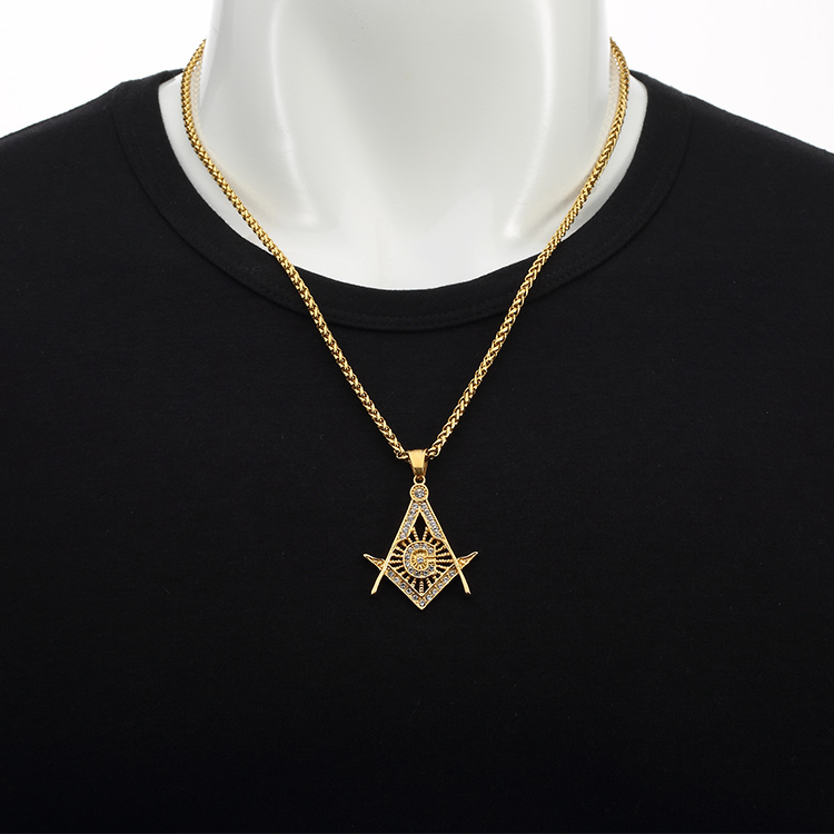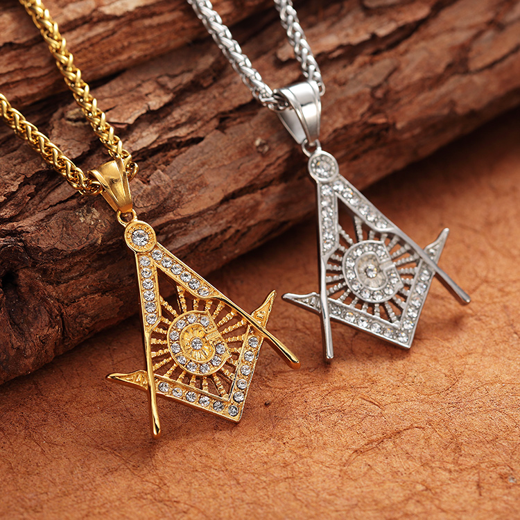 Trendy Free and Accepted Masons Pendant Gold Plated Jewelry Rhinestone Inlaid Stainless Steel Religious Necklace S337/S338 | ||||||